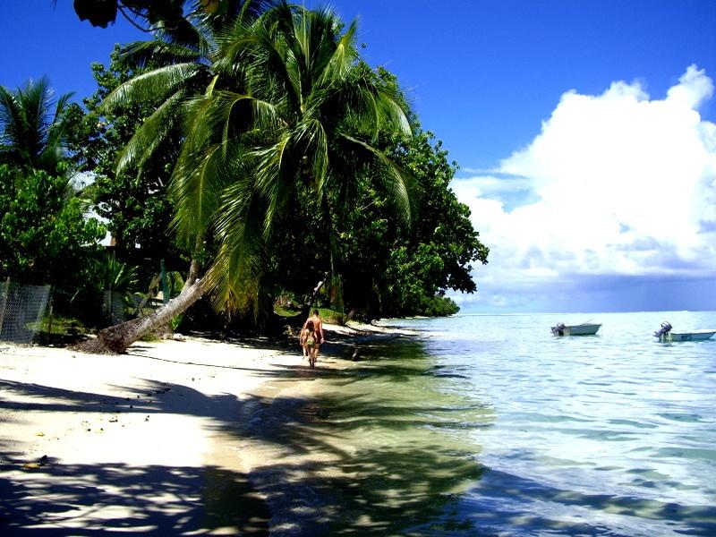 Slip off your flip-flops as they're called here and feel the endlessly fine sand sliding between your toes. Close your eyes, breathe in the softness that envelops you, sweet Huahine, and particularly Avea Bay. There's a hotel I know, the Relais Mahana, with "deluxe beach" bungalows facing the ocean on the bay's most beautiful beach. In the evening, sailors moor in front of the hotel and dine at the hotel's Tenahe restaurant; it's true the decor is somewhat kitsch, with slightly old-fashioned rattan chandeliers, but the view of the Pacific is stunning. In the morning, the boats have often already departed, take a dip to see the little fish swarming around me, provided I have a piece or two of bread; it's best not to swim barefoot (as elsewhere in the Pacific) and especially not here if you don't want your toes to encounter the slimy mass of sea cucumbers, a type of invertebrate mollusc that teems in the area. The island's vegetation is a green like nowhere else, piercing, as if the flora wanted to break the silence reigning over this island by bursting with its colours.